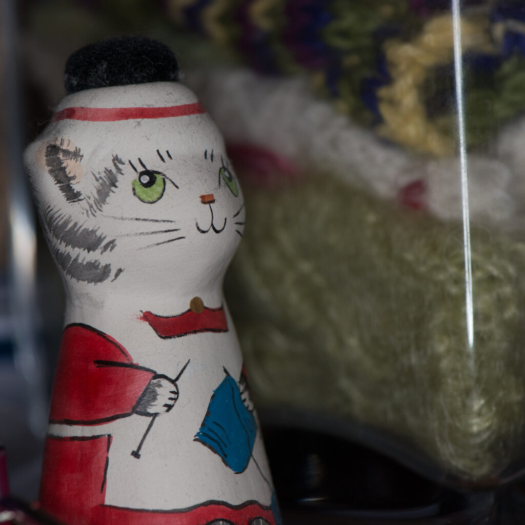 I’m not entirely sure what this is – I’m guessing it’s some sort of ornamental finger guard and pin cushion that stands guard over Debbie’s knitting.