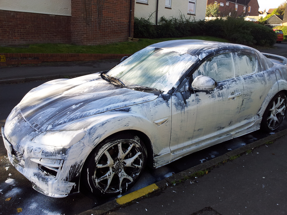 I left for work at 8.30am  only to discover both mine and my wife’s cars, along with 3 or 4 other cars had been painted with white emulsion paint…the sun was out and was drying the paint quickly. Fortunately some neighbours with a pressure washer came to my rescue and we got rid of almost all the paint…it took 2 and a half hours though ;-).