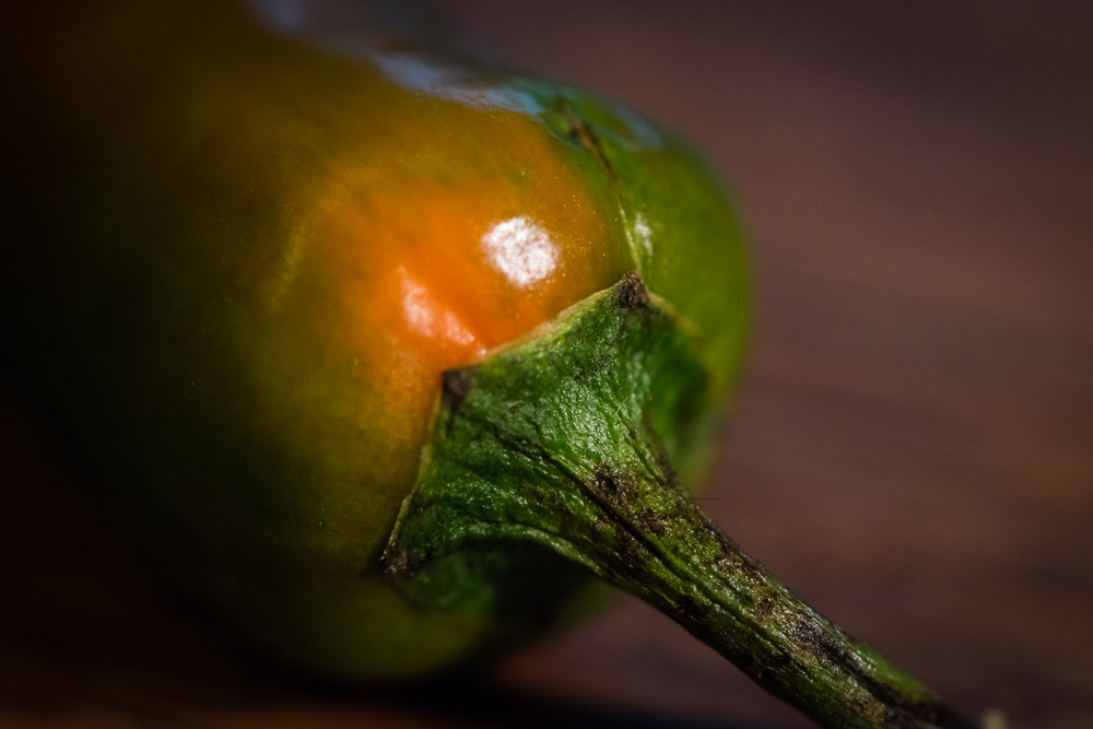 More desk top photography – we’ve nearly had a week of it now…today I had a rummage around in the fridge and found this green chilli that was trying to turn a little red.