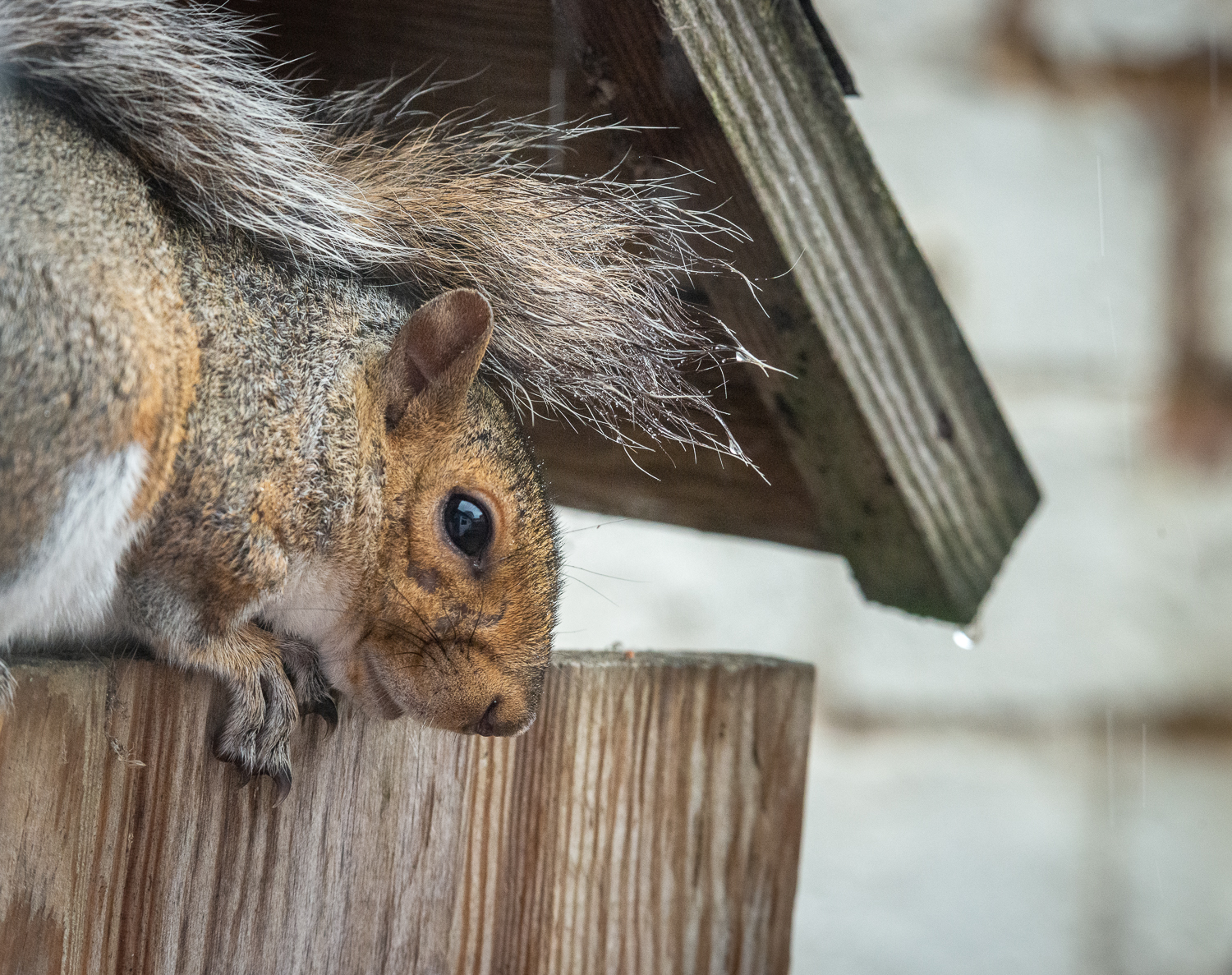 It poured down at lunchtime today, just as one of the local squirrell’s came visiting.