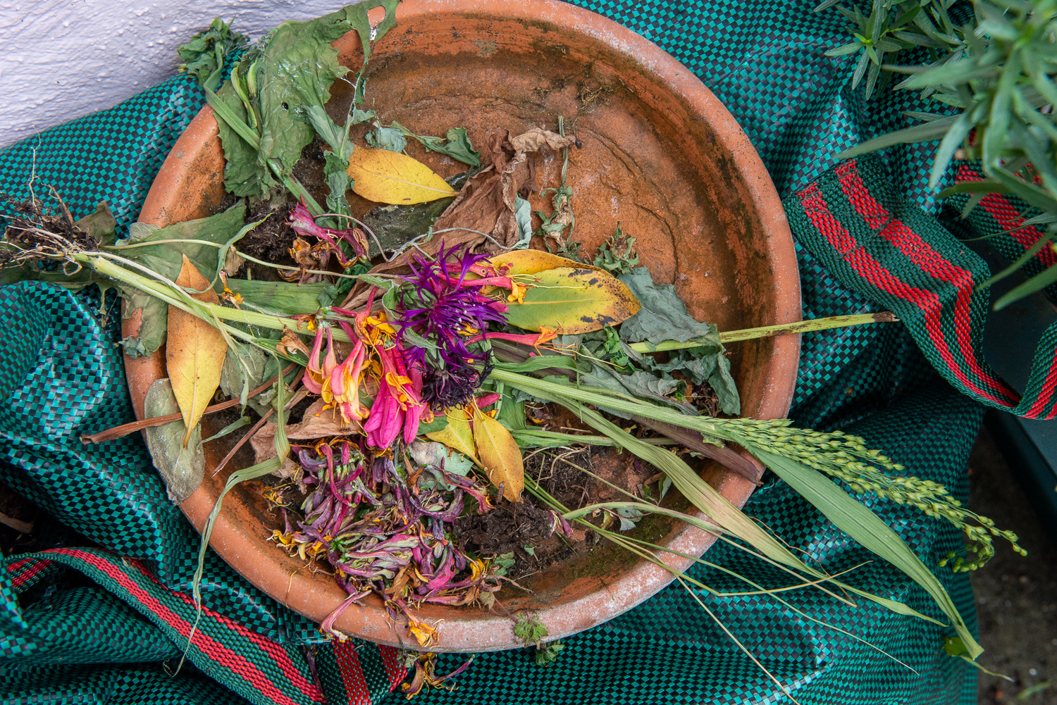 Yesterday’s image was of some grasses (you can see then in the image below) that Debbie had pulled up from the garden and thrown away. This shot is of some of the flowers and weeds she had extracted and dead headed and thrown into the same spot. Getting in close with the macro lens produces this abstract Jackson Pollock like image.