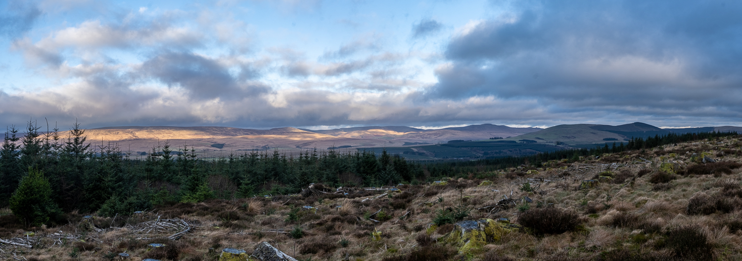 Todays picture is from the top of our walk where we turn around to head back home. A 7 shot panorama of the view as the sun tried to break through the clouds and illuminate the hills in front of us.