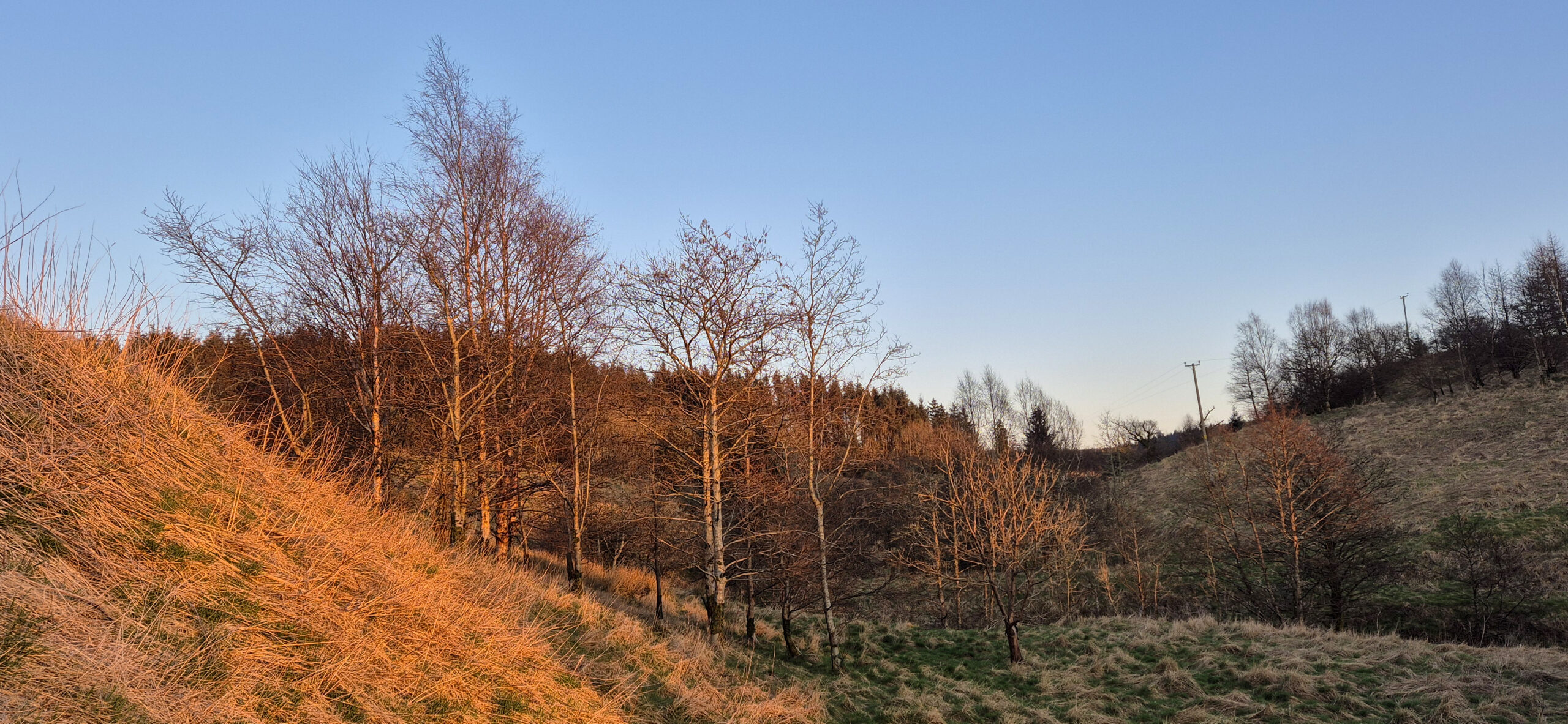 This is a shot of the outback that is our back garden looking out past our neighbours land and into the forestry area. The picture shows a fairly distinct split between the area still warmed by the setting sun and the area that is now in shade as the evening moves in bringing to mind the following poem by Ted Hughes