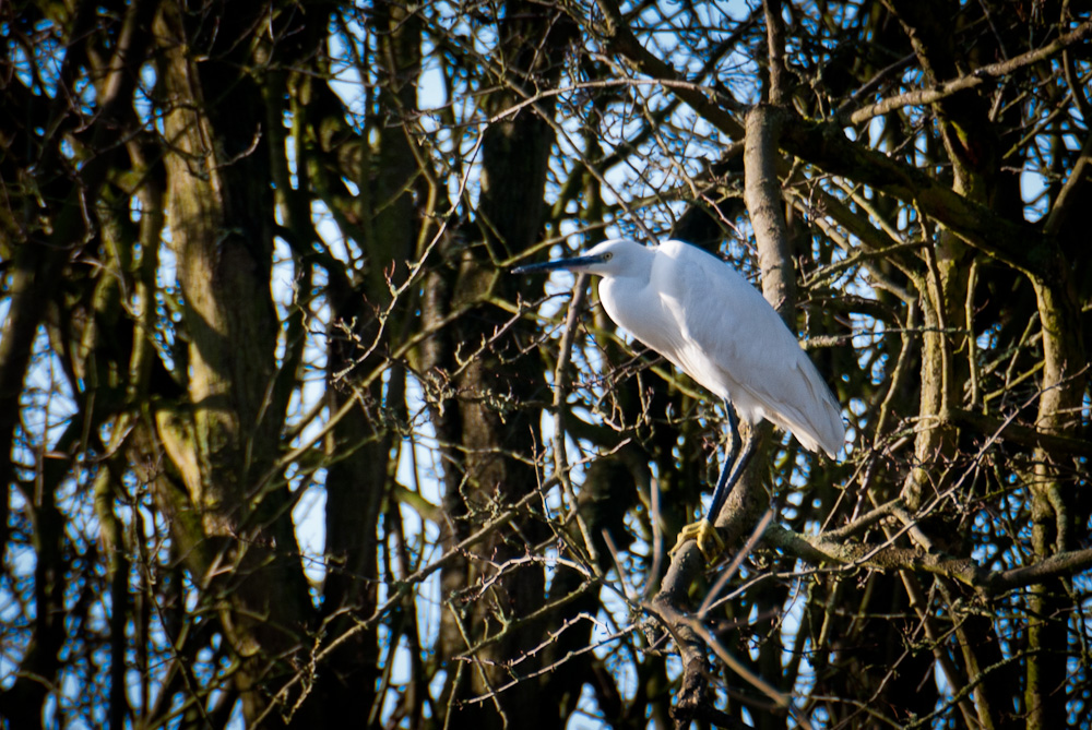 I spotted this fellow on a wander through Dunmow last Sunday morning. I accidentally disturbed him (I had no idea he was there) and he flew off into these trees. This looks to my very untrained eye to be a Little Egret – a type of heron to you and me. Give the image a click to get a closer look.
