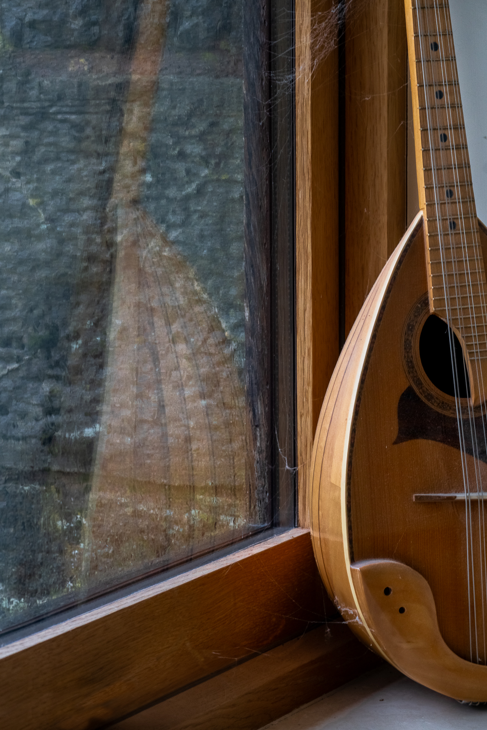 Today our Flickr Challenge was reflection. I created two images for this and am leading with the shot created entirely in camera of my Mandolin covered in cobwebs. I cleaned it off and retook the shots without the cobwebs, but actually preferred this shot.